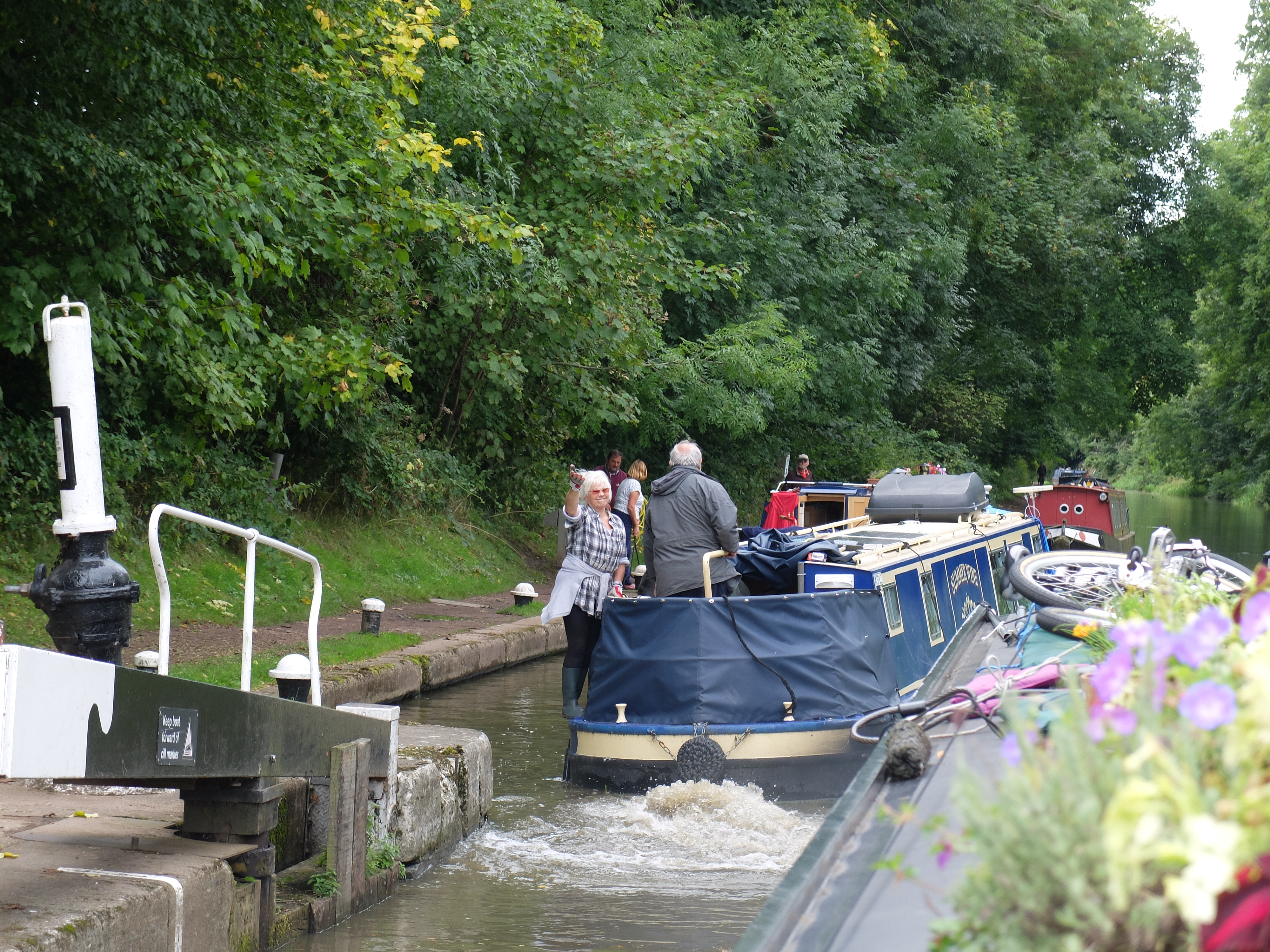 We paired up with nb Amadeus going down the Hatton flight. Half way down the flight there was an ‘incident’ with a cyclist. The ‘elderly’ father on Amadeus (misuse of the word – he was only 71) and a speeding cyclist met on the towpath under a bridge, the cyclist and his bike ended up in the canal. There was much yelling and abuse from the cyclist, and a CRT volunteer turned up to help retrieve the bike. A little later Amadeus had a problem with her propeller, and we carried on without her. Further down the locks we were interviewed by two bike riding policemen who had been called by the biker, he had accused the father of pushing him into the canal. Near the bottom of the flight the volunteer lock keeper caught up with us and said “Oh, you are the naughtly boat”, he thought that we had pushed the cyclist in!